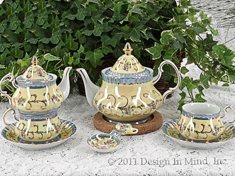 White porcelain teaware with pink floral design on a soft blue and yellow background. Embellished and edged in metallic gold with a very high gloss over all. Tea for One includes 8 oz teapot and 6 oz cup with saucer. See Teapots>>Fine China Teasets>>Victorian China for other pieces.