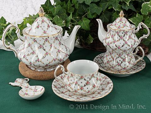 White porcelain teaware with pink roses embellished with metallic gold swishes. Very elegant and nicely done. Tea for One includes 8 oz teapot and 6 oz cup with saucer. See Teapots>>Fine China Teasets>>Victorian China for other pieces.