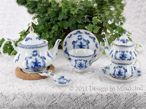 White porcelain teaware. Dutch windmill with garland in delft blue. Edged in metallic gold. Tea for One includes 8 oz teapot and 6 oz cup with saucer. See Teapots>>Fine China Teasets>>Victorian China for other pieces.